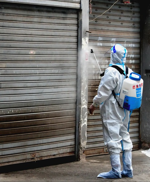 肩負(fù)噴霧器進(jìn)行消殺工作。巴南區(qū)疾控中心供圖