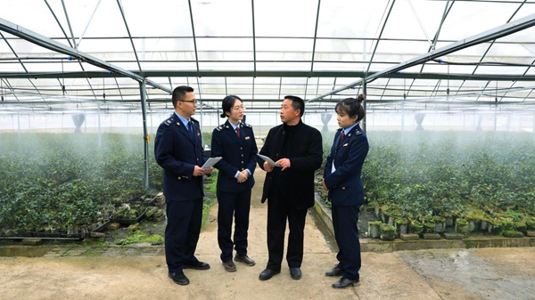 圖為秀山縣稅務(wù)局工作人員走進(jìn)重慶渝林油茶研究中心有限公司育苗基地宣傳稅費(fèi)優(yōu)惠政策。何川攝