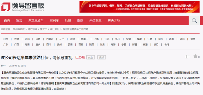 - 領(lǐng)導(dǎo)留言板截圖 人民網(wǎng)重慶3月27日電 (陳琦)近日,有網(wǎng)友在人民網(wǎng)“領(lǐng)導(dǎo)留言板”留言,反映單位已有半年未給員工繳納社保。針對該情況,重慶兩江新區(qū)稅務(wù)局進(jìn)行核實(shí)后回復(fù)稱:已對該企業(yè)下達(dá)社會保險費(fèi)限期繳納決定書,公司承諾將在4月前繳清欠費(fèi)!