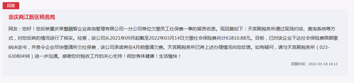 針對網(wǎng)友的留言,重慶兩江新區(qū)稅務(wù)局回復(fù)稱:兩江新區(qū)天宮殿稅務(wù)所通過現(xiàn)場約談、查詢系統(tǒng)等方式,對網(wǎng)友反映的情況進(jìn)行了核實(shí)。經(jīng)查,該公司從2021年09月起截至2022年03月14日,欠繳社會保險費(fèi)共計63810.88元。