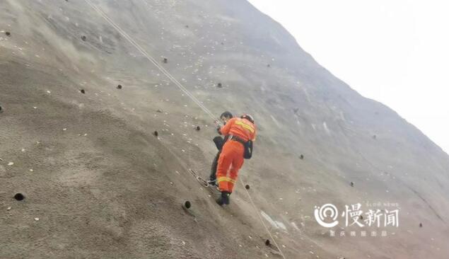 時間就是生命!救援人員馬上進行了分組:一組人馬上在堡坎下鋪設消防救生氣墊;另一組人則前往堡坎上的山頂,對錨點進行固定保護。