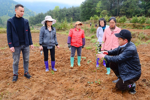 專業(yè)技術人員正在指導工人們修剪油茶樹。魯詩勤攝