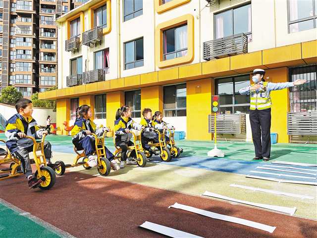 3月28日是我國第27個“全國中小學(xué)生安全教育日”,全市公安民警紛紛走進(jìn)校園,教孩子們?nèi)绾畏莉_反詐防霸凌,增強(qiáng)學(xué)生安全意識,維護(hù)校園安全。圖為九龍坡區(qū)和雅幼兒園里,民警通過簡易教具模擬交通場景,指揮孩子們安全騎行。