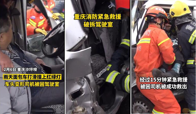 @重慶消防 消息,2月6日,重慶沙坪壩。一輛面包車與紅綠燈桿發(fā)生碰撞,面包車車頭嚴(yán)重變形,司機腿部被卡,無法動彈。消防人員緊急救援,利用液壓剪切鉗等器材,對駕駛室進(jìn)行破拆,經(jīng)過15分鐘的緊張救援,成功救出被困司機。