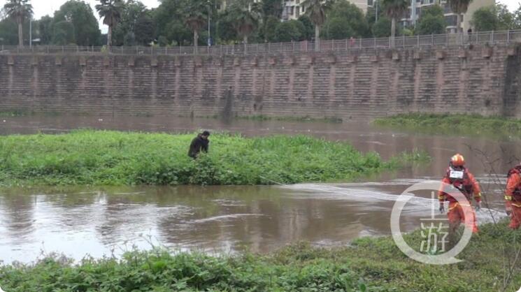 2月17日下午1點過,璧山區(qū)消防救援支隊指揮中心接到報警稱,青杠街道一人被困河中央。接到報警后,青杠消防救援站救援人員立即抵達現(xiàn)場,只見離岸約20米遠的一座河心孤島上,有一名中年男子被困,四周水流湍急,水位還在不斷上漲。