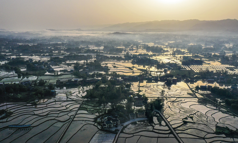 梁平區(qū)安勝鎮(zhèn)龍印村,水田在朝陽(yáng)的映射下美不勝收。熊偉攝