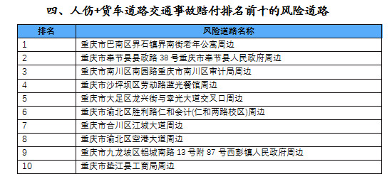 《重慶市2021年度道路交通事故保險(xiǎn)理賠風(fēng)險(xiǎn)路段》報(bào)告中,人傷+貨車道路交通事故賠付排名前十的風(fēng)險(xiǎn)道路。重慶市保險(xiǎn)行業(yè)協(xié)會供圖