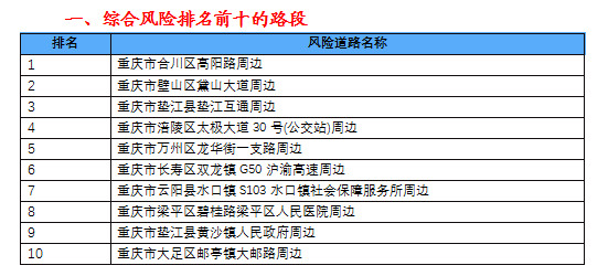 《重慶市2021年度道路交通事故保險(xiǎn)理賠風(fēng)險(xiǎn)路段》報(bào)告中,綜合風(fēng)險(xiǎn)排名前十的路段。重慶市保險(xiǎn)行業(yè)協(xié)會供圖