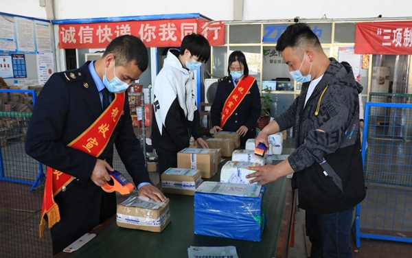 稅務(wù)人員和快遞員一起把稅費(fèi)宣傳單貼在快遞包裝盒上。何川攝