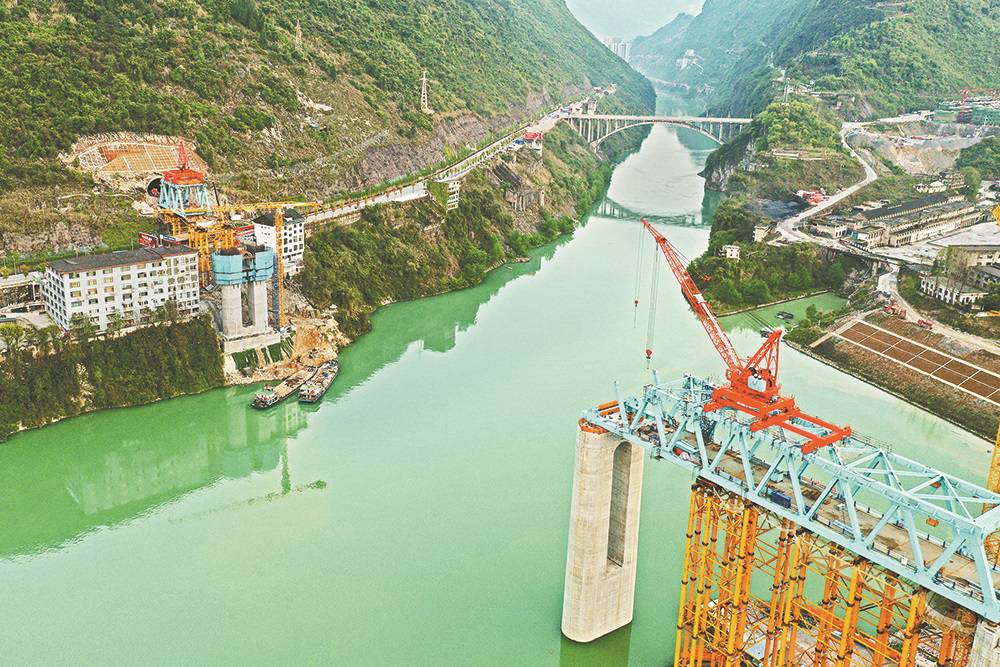 4月2日,在彭水自治縣渝湘高鐵清水坪烏江大橋建設現(xiàn)場,工人們正在加快推進項目建設。