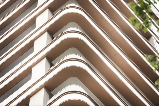大面積落地LOW-E玻璃幕墻窗,配合流線型鋁板,形成“全面屏”視覺(jué)效果,歸零建筑邊界;而曲線金屬線條、建筑轉(zhuǎn)折處的弧面處理、輕盈的弧線挑檐,又使立面像一塊充滿動(dòng)感、景象變幻的“曲面屏”,達(dá)成空間與光影的藝術(shù)融合,匯成城市一道靚麗風(fēng)景。