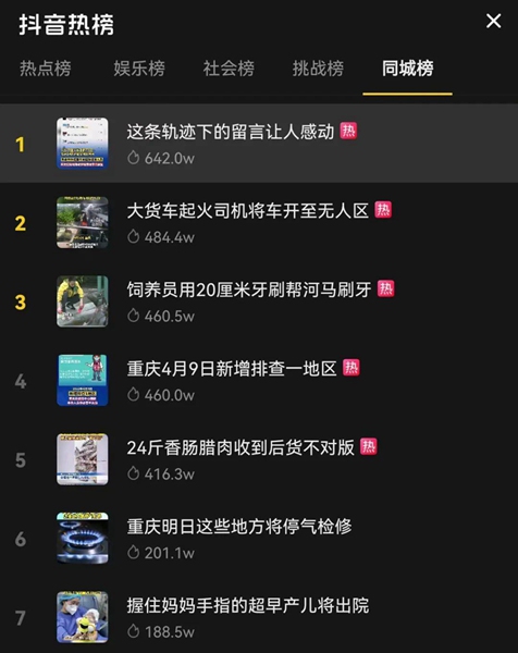 重慶發(fā)布截取了部分網(wǎng)友留言制作的視頻——《這條軌跡下的留言讓人感動(dòng)》,連續(xù)多日登上抖音同城榜,并長(zhǎng)時(shí)間在榜單第一。