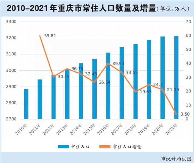 2021年,重慶人口發(fā)生了哪些變化?4月14日,市統(tǒng)計(jì)局對(duì)2021年全市人口變動(dòng)抽樣調(diào)查數(shù)據(jù)進(jìn)行解讀稱,2021年全市常住人口為3212.43萬人,與2020年相比,常住人口增加了3.5萬人,連續(xù)17年保持增勢(shì)。