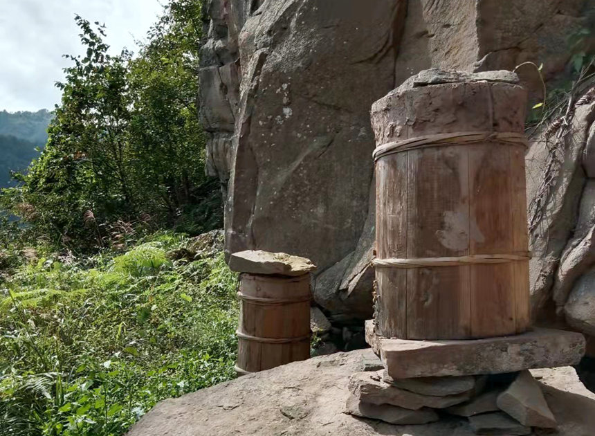 劉益洪放在山崖下的蜂桶。受訪者供圖