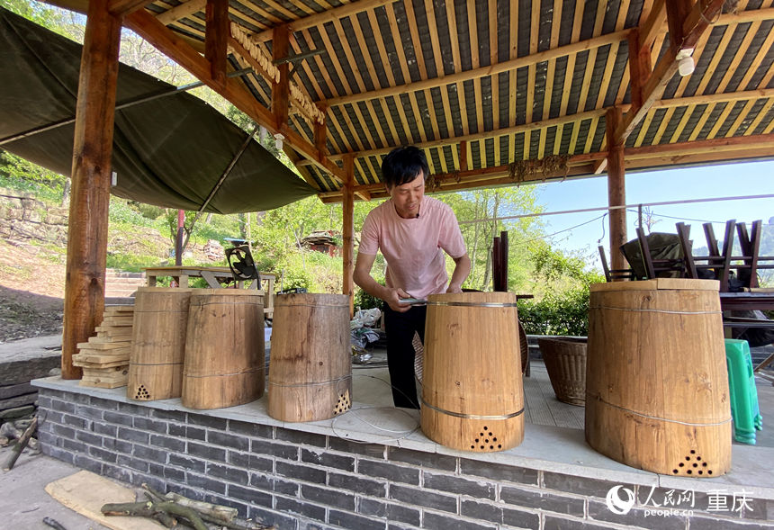 劉益洪在家利用廢舊木材制作蜂桶。人民網(wǎng) 劉政寧攝