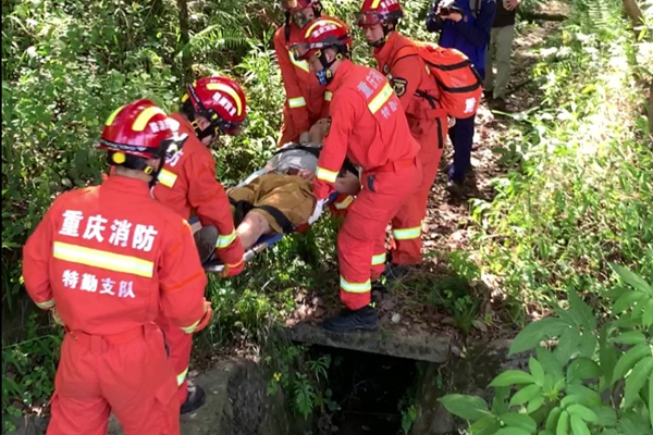 消防救援人員正在轉(zhuǎn)移受傷男子。重慶市消防救援總隊(duì)特勤支隊(duì)供圖