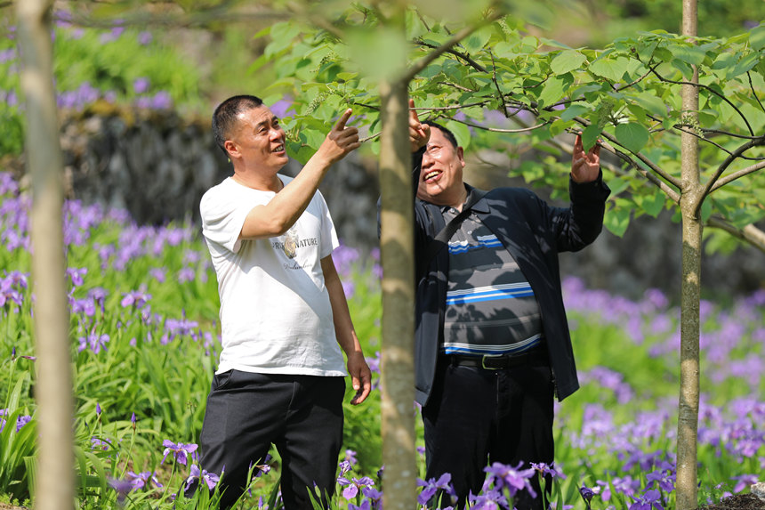 農(nóng)技專家李繼暉(右)深入田間,為村民指導(dǎo)山桐子春季管護(hù)技術(shù)。趙勇攝