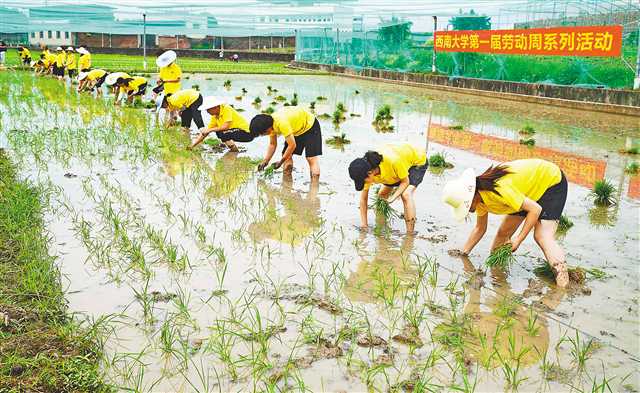 4月27日,西南大學(xué)農(nóng)學(xué)與生物科技學(xué)院35名學(xué)生,來到位于北碚歇馬的西南大學(xué)水稻研究所實(shí)驗(yàn)基地,開展“學(xué)習(xí)隆平精神 躬耕田野實(shí)踐”水稻插秧生產(chǎn)勞動實(shí)踐活動。田間地頭的勞作讓學(xué)生們更加懂得“絕知此事要躬行”的道理。該校農(nóng)學(xué)與生物科技學(xué)院黨委書記陽義健介紹,在不同的季節(jié)學(xué)院會安排學(xué)生參加不同的田間勞動課程和活動,包括水稻、油菜、薯類、玉米、小麥的栽培和管理等。通過這些生產(chǎn)實(shí)踐活動,幫助學(xué)生樹立正確的勞動價值觀,鍛煉他們的勞動技能。