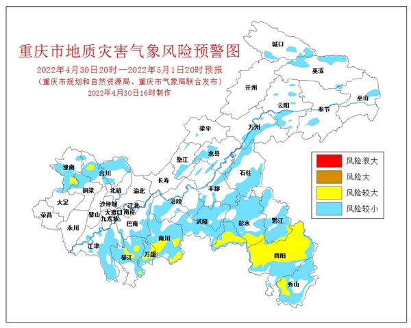4月30日16時,重慶市規(guī)劃和自然資源局、重慶市氣象局聯(lián)合發(fā)布全市地質災害氣象風險預警。