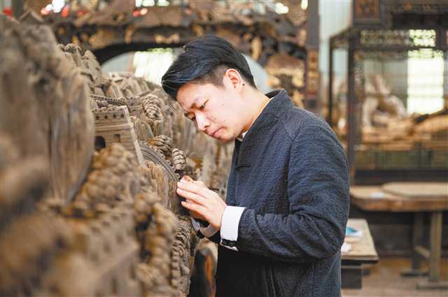 2014年,在父親的勸說下,周奎辭掉前途不錯的工作,返鄉(xiāng)向父親——周氏木作技藝第四代傳承人周成文學(xué)習(xí)木工雕刻。從此,他把木雕和古建筑當(dāng)成了自己的愛好。
