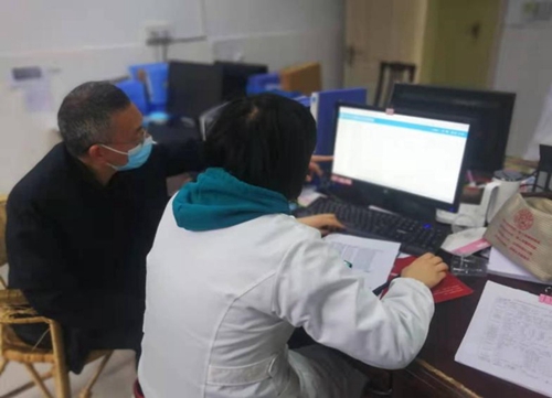 執(zhí)法人員現(xiàn)場(chǎng)指導(dǎo)協(xié)管員進(jìn)行平臺(tái)操作。石柱縣衛(wèi)生健康綜合行政執(zhí)法支隊(duì)供圖
