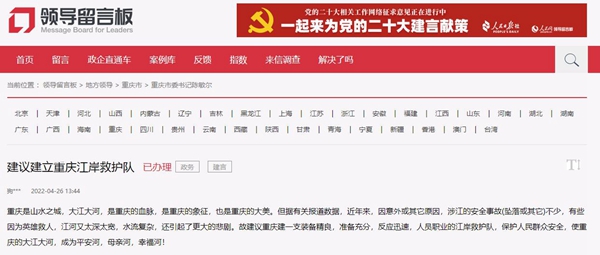 4月26日,該網(wǎng)友在留言中寫道:“重慶是山水之城,大江大河是重慶的血脈,是重慶的象征,也是重慶的大美。但據(jù)有關(guān)報(bào)道數(shù)據(jù)顯示,近年來(lái),因意外或其他原因,涉江的安全事故(墜落或其它)時(shí)有發(fā)生,有些因?yàn)橛⒂戮热耍佑痔钐珜,水流?fù)雜,還引起了更大的悲劇!