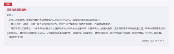 收到留言后,重慶市應(yīng)急管理局工作人員第一時(shí)間跟留言網(wǎng)友電話聯(lián)系,向其介紹了重慶市水上應(yīng)急救援機(jī)制、力量建設(shè)等情況。針對(duì)網(wǎng)友提出的建議,也給出了下一步的工作計(jì)劃。