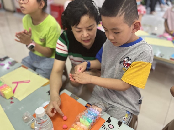 講座之后,兒童軟陶DIY活動開啟,重慶普瑞眼科醫(yī)院工作人員及七星崗街道社區(qū)教育輔導(dǎo)員雷敏帶領(lǐng)孩子與家長共同參與陶藝制作。