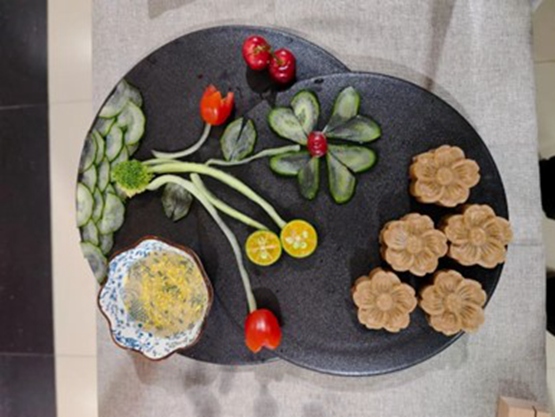比賽現(xiàn)場,日常的湯羹、糕點、涼菜,通過護理人員的手,巧妙地加入芡實、通草、川貝等中醫(yī)藥元素,呈現(xiàn)出“郁金香伴”“太極四味”“益氣補血花膠雞湯”“荷塘爭艷”等極有創(chuàng)意、同時兼顧視覺美和味覺美的中醫(yī)藥特色美食,引得現(xiàn)場員工、患者紛紛駐足品嘗,并發(fā)圖分享到朋友圈,助力中醫(yī)藥文化傳播。