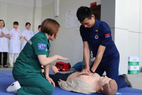 活動中,來自榮昌區(qū)中醫(yī)院急診科兩任護士長盛秀英和唐敏為消防官兵演示并教授急救包扎、心肺復(fù)蘇等應(yīng)急操作,手把手教會消防官兵基本操作內(nèi)容。消防隊員帶領(lǐng)醫(yī)護人員參觀了消防器材,現(xiàn)場展示繩結(jié)操練等。