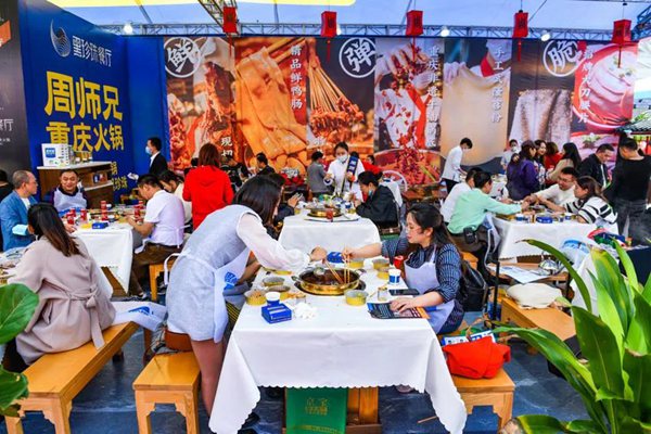市民在重慶火鍋節(jié)現(xiàn)場(chǎng)品嘗火鍋。(資料圖) 鄒樂攝
