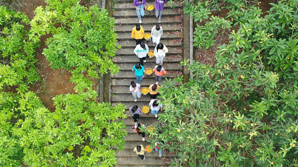 孩子們搬著枇杷走在果園里。張茂玉攝