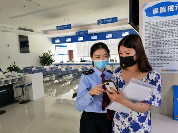 重慶經(jīng)開區(qū)稅務(wù)人員輔導(dǎo)市民使用提取碼,在“重慶稅務(wù)”微信公眾號下載契稅完稅證明。韋小鈾 攝