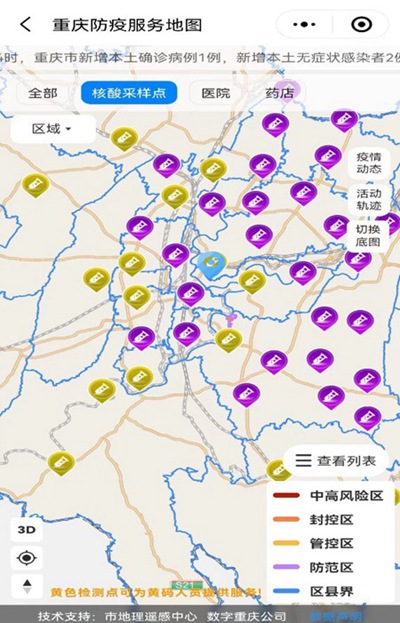 “渝康碼”以及百度、高德、騰訊、美團等地圖上線了“重慶防疫服務地圖”,方便群眾一圖查詢核酸采樣點、疫情動態(tài)、感染者活動軌跡、醫(yī)院、藥店、封控管控防范“三區(qū)”以及生活服務等信息,并為市民提供相關查詢、預約、導航等服務。