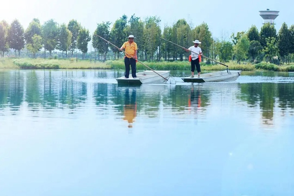 廣陽(yáng)島上工作人員正在清漂作業(yè)。