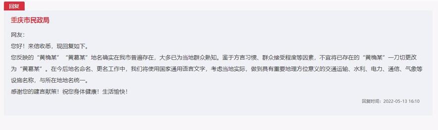 針對該網(wǎng)友反應(yīng)的問題,重慶市民政局作出解釋:“黃桷某”“黃葛某”地名確實在重慶市普遍存在,大多已為當(dāng)?shù)厝罕娛熘。鑒于方言習(xí)慣、群眾接受程度等因素,不宜將已存在的“黃桷某”一刀切更改為“黃葛某”。在今后地名命名、更名工作中,將使用國家通用語言文字,考慮當(dāng)?shù)貙嶋H,做到具有重要地理方位意義的交通運輸、水利、電力、通信、氣象等設(shè)施名稱,與所在地地名統(tǒng)一。