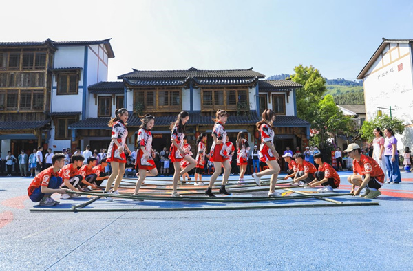 獵神三巷內(nèi),游客正在體驗(yàn)跳竹竿舞。熊偉攝