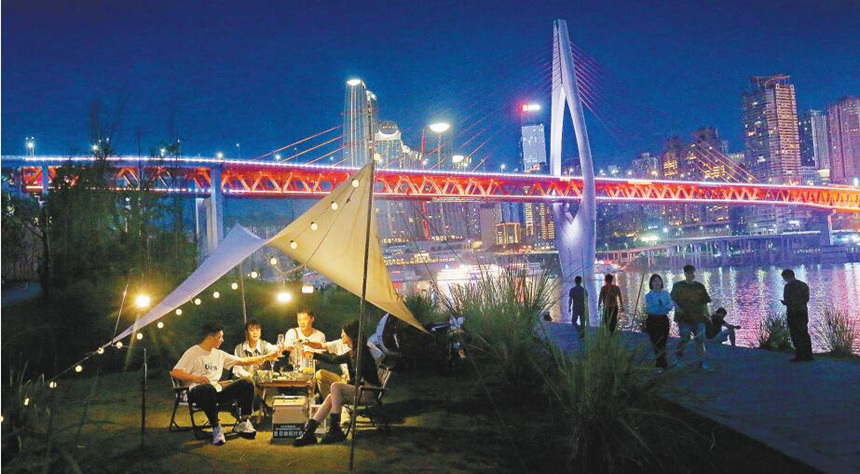 5月10日,千廝門(mén)嘉陵江大橋與江灘親水公園吸引市民前來(lái)露營(yíng)、散步、賞景。近年來(lái),隨著“兩江四岸”生態(tài)修復(fù)提檔升級(jí),一個(gè)個(gè)綠色親水濱江公園相繼建成,給市民休閑健身提供了更多好去處。特約攝影 鐘志兵/視覺(jué)重慶