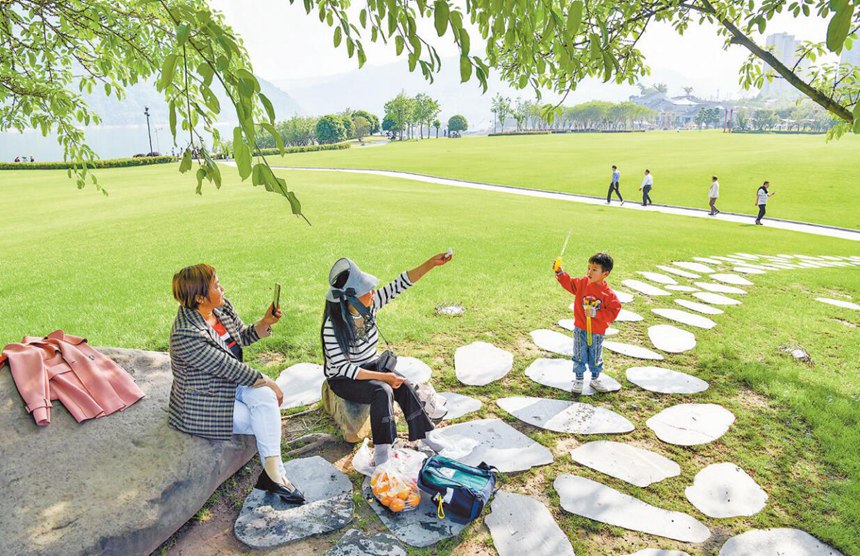 4月20日,云陽(yáng)縣環(huán)湖綠道月光草坪,市民帶著孩子享受休閑時(shí)光。環(huán)湖綠道沿線老舊小區(qū)改造惠及11307戶居民。記者 謝智強(qiáng) 攝/視覺(jué)重慶