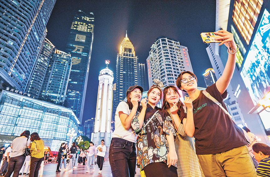 彰顯出國(guó)際大都市風(fēng)范的解放碑商圈,不僅成為購(gòu)物天堂,而且是重慶的打卡勝地,備受中外游客喜愛(ài)。(攝于2019年9月)首席記者 龍帆 攝/視覺(jué)重慶