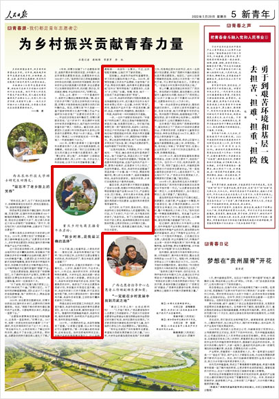本版推出3位青年志愿者的故事,講述他們?cè)谥︵l(xiāng)村振興過(guò)程中的付出與收獲。他們中有人對(duì)農(nóng)民開(kāi)展生產(chǎn)技術(shù)幫扶,有人通過(guò)電商直播將農(nóng)產(chǎn)品銷出大山,還有人用心扶貧濟(jì)困、關(guān)愛(ài)留守兒童……他們?yōu)猷l(xiāng)村振興注入青春動(dòng)能,讓青春之花綻放在祖國(guó)最需要的地方。