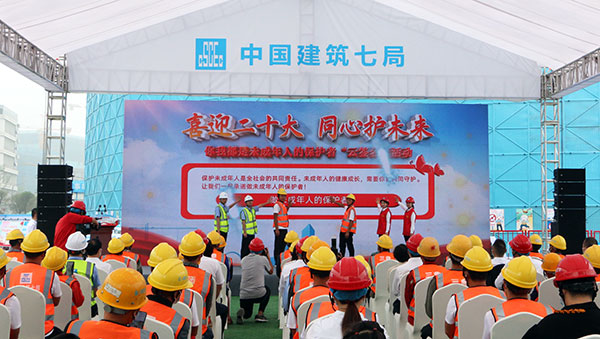 5月29日,由中國(guó)建筑集團(tuán)有限公司主辦,中國(guó)建筑第七工程局有限公司承辦的"喜迎二十大 同心護(hù)未來(lái)"你我都是未成年人的保護(hù)者"云簽名"暨2022年全國(guó)農(nóng)村留守兒童關(guān)愛(ài)保護(hù)"百場(chǎng)宣講進(jìn)工地"活動(dòng)啟動(dòng)儀式在重慶市中建七局西部重慶科學(xué)城科學(xué)谷項(xiàng)目舉行。