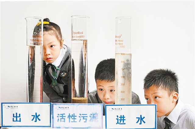 5月28日,悅來污水處理廠,幾名參加開放日活動的小學(xué)生觀察污水處理廠不同工藝環(huán)節(jié)水體樣本。記者 萬難 攝/視覺重慶