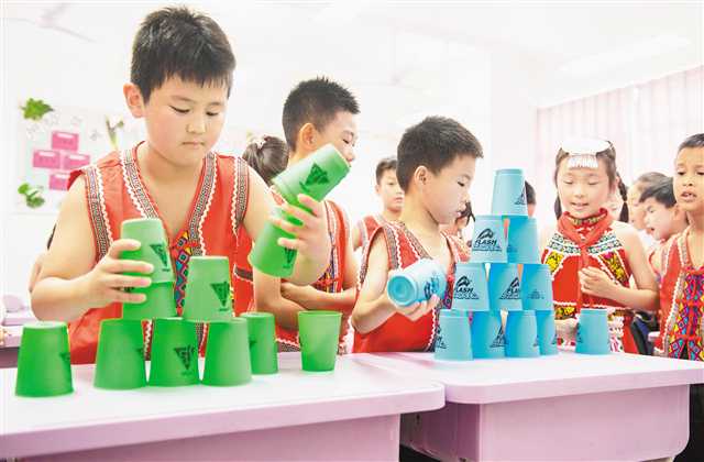 5月31日,江北區(qū)玉帶山小學(xué),孩子們身著民族服裝,參加“各族兒童心向黨、科技藝術(shù)筑夢想”飛疊杯比賽。記者 崔力 見習(xí)記者 劉旖旎 攝/視覺重慶