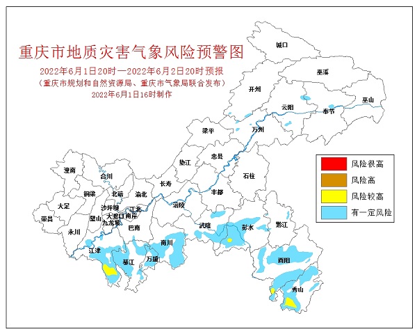 6月1日,重慶市規(guī)劃和自然資源局、重慶市氣象局聯(lián)合發(fā)布全市地質(zhì)災害氣象風險預警。