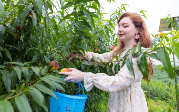 6月2日,走進(jìn)東溫泉鎮(zhèn)黃金林村,一片片綠油油的桃樹上,一個個飽滿的紅玉脆桃、白花桃、錦繡黃桃掛滿枝頭。黃金林村曾是市級貧困村,多年來,該村通過種植錦繡黃桃、蜂糖李和翠冠梨等果樹,發(fā)展了“十里花果長廊”產(chǎn)業(yè)項目,推動產(chǎn)業(yè)發(fā)展,實現(xiàn)了整村脫貧,一棟棟鄉(xiāng)村民舍點綴其中,宛如畫卷。外國友人們深入果林,采摘鮮桃,感受豐收的喜悅,體驗巴南的生態(tài)文明和鄉(xiāng)村振興建設(shè)成果。