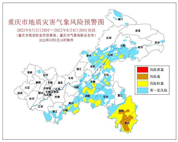 6月5日16時,重慶市規(guī)劃和自然資源局、重慶市氣象局聯(lián)合發(fā)布全市地質(zhì)災(zāi)害氣象風(fēng)險預(yù)警。