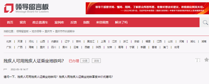 人民網(wǎng)重慶6月11日電 (陳琦)“請問一下,殘疾人可以用殘疾人證乘坐地鐵嗎?殘疾人用殘疾人證乘坐地鐵享受半價優(yōu)惠嗎?” 近日,有群眾在人民網(wǎng)“領(lǐng)導(dǎo)留言板”上向重慶市市長胡衡華留言咨詢。【留言原文鏈接】