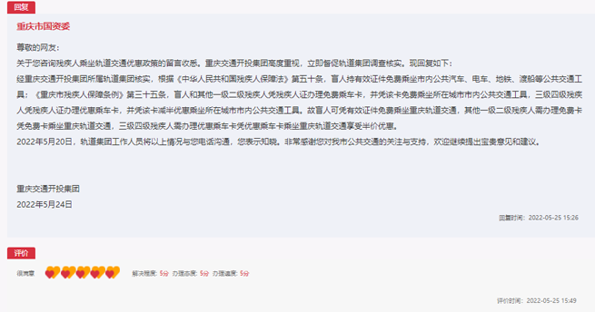 群眾對重慶交通開投集團回復(fù)給予五“心”好評