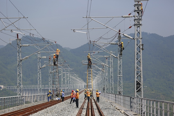 人民網(wǎng)重慶6月16日電 15日上午,在重慶鐵路樞紐東環(huán)線御臨河雙線特大橋上,中國鐵路成都局集團公司重慶供電段的職工手持各種工具,正在對線路供電設(shè)備進行檢測。標(biāo)志著重慶鐵路樞紐東環(huán)線已進入線路供電設(shè)備靜態(tài)驗收階段,為線路按期開通運營做準(zhǔn)備。